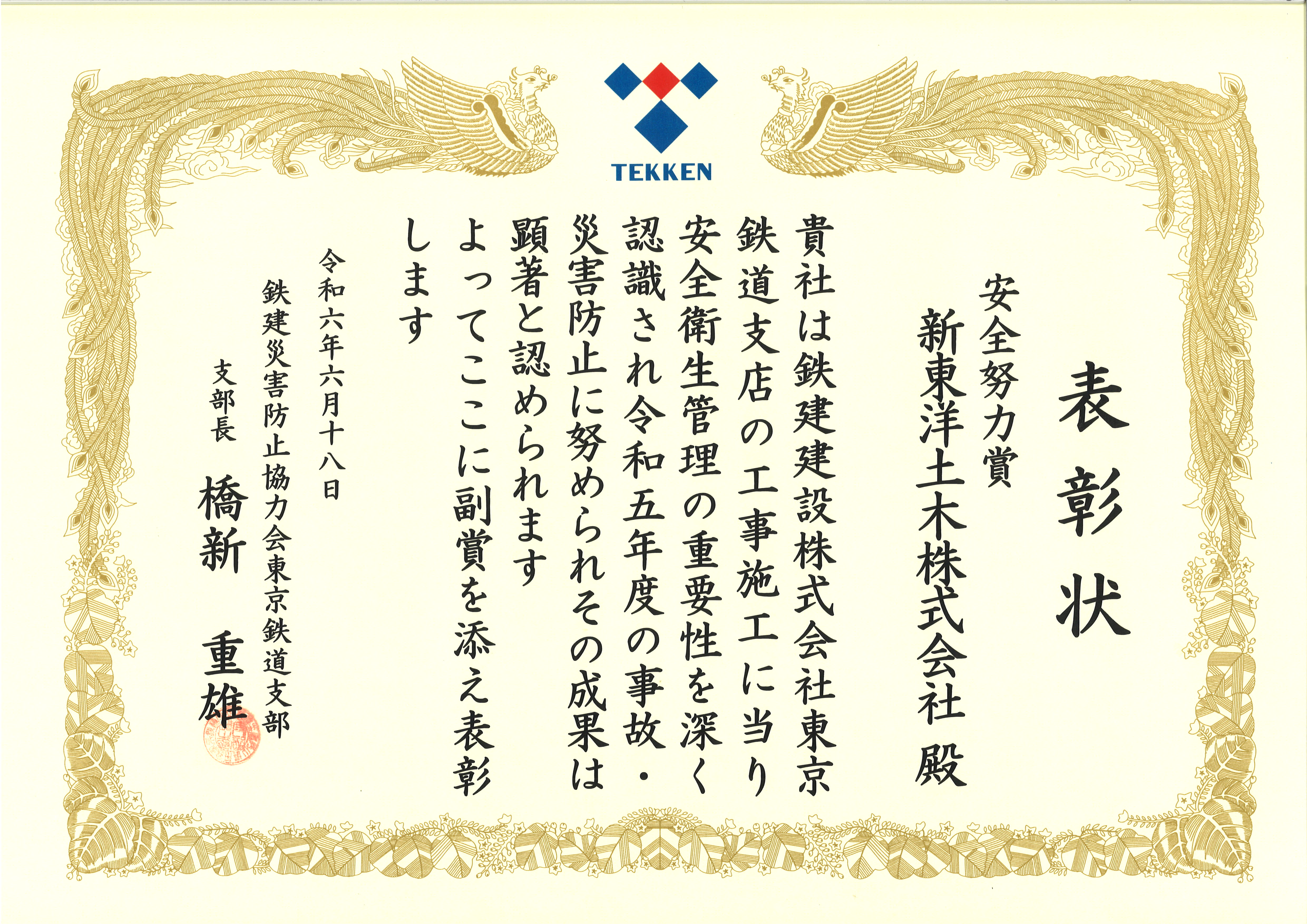 鉄建建設株式会社様から支部長表彰を受けました。
