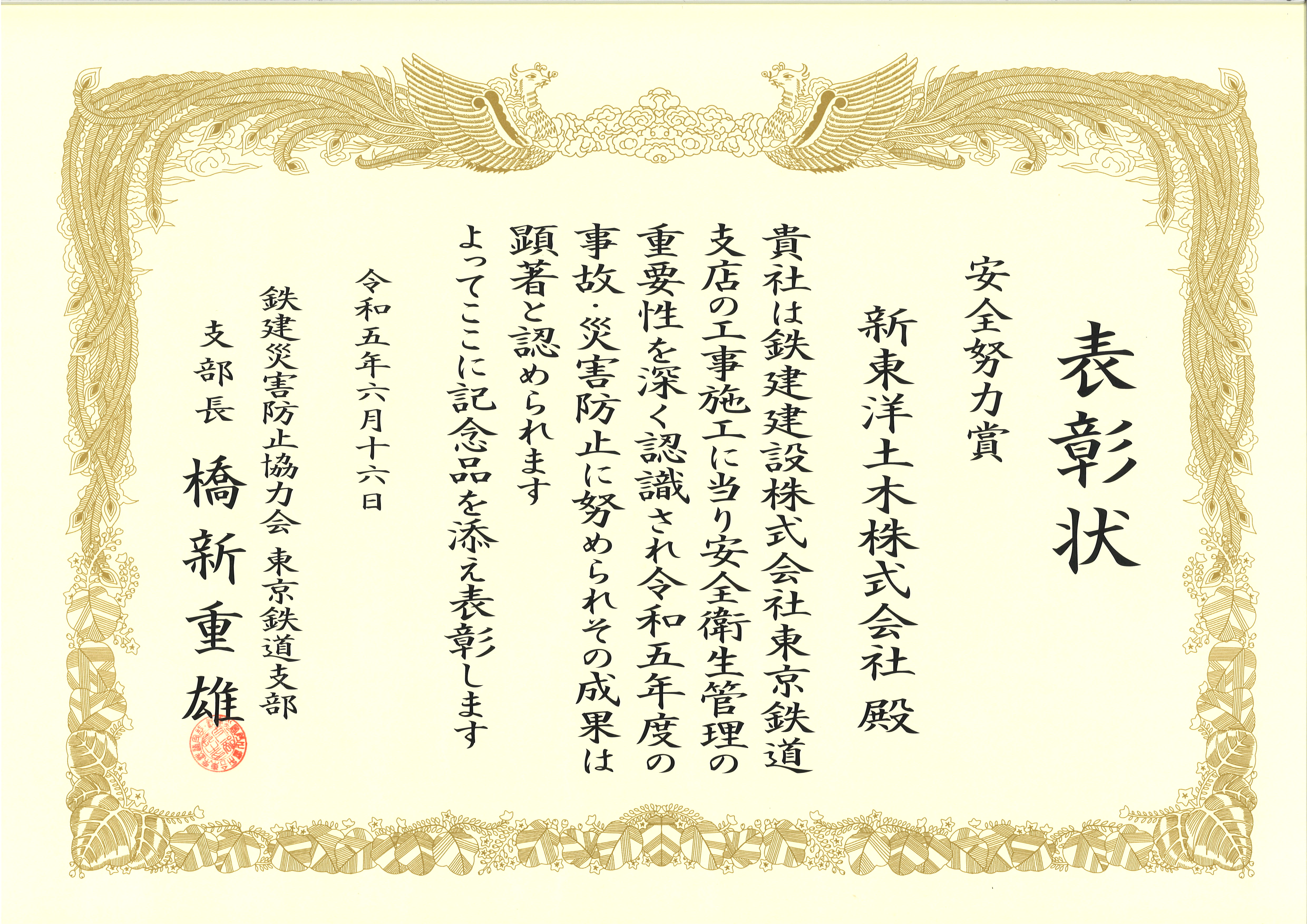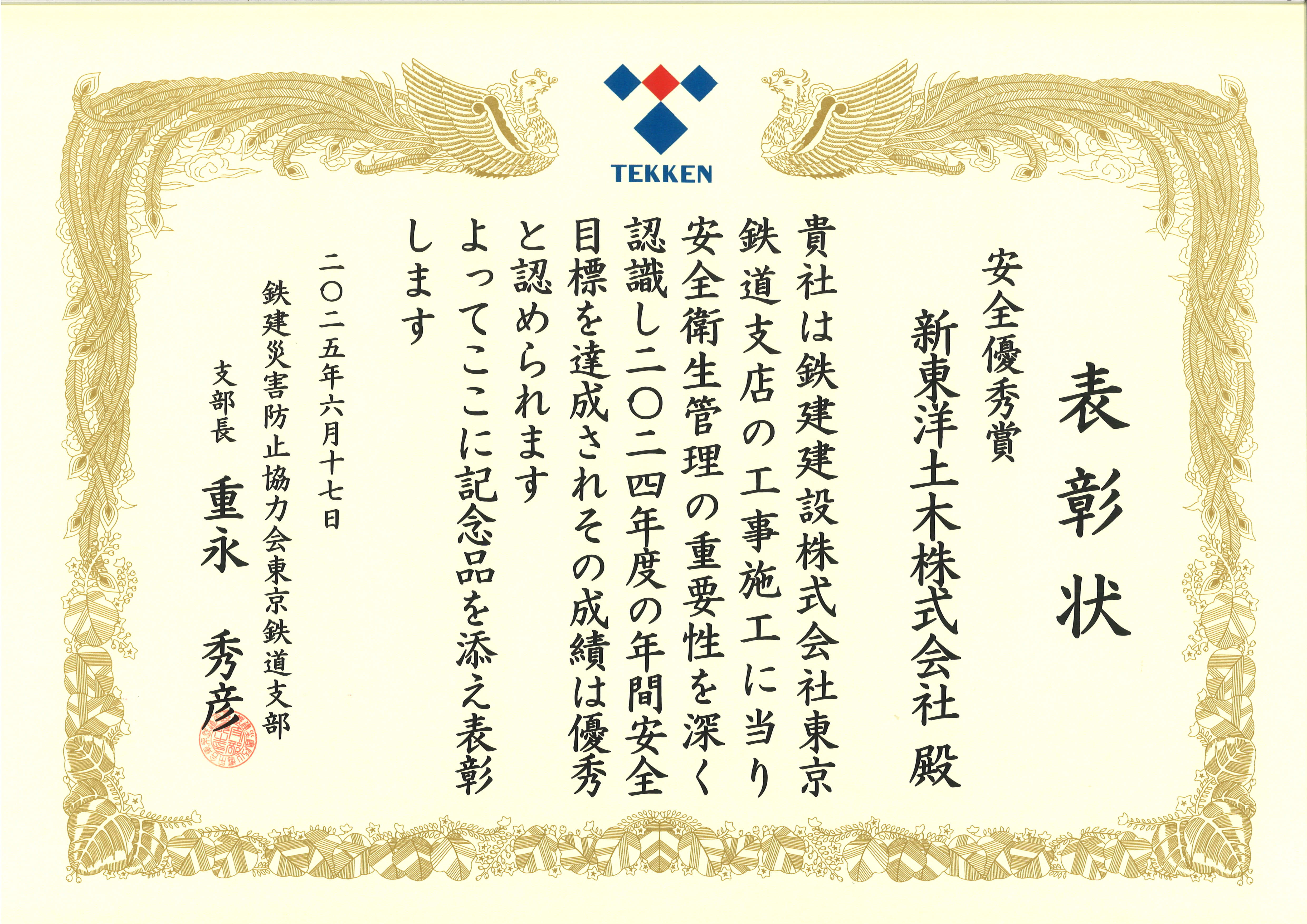 鉄建建設株式会社様から支部長表彰を受けました。